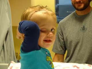 Cooper slept great last night. The only time he woke up was when the nurse got him up. However, he was very fussy today. He wanted to sleep most of the day and didn't have an appetite. The swelling in his head looked as though it had gotten worse. The doctors decided to do another CT Scan to make sure they weren't missing anything. The CT Scan looked normal which was good, but it didn't answer any of our questions.